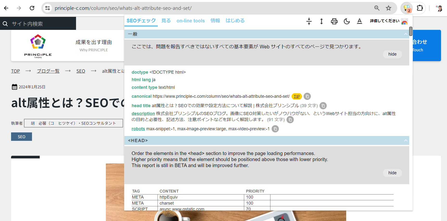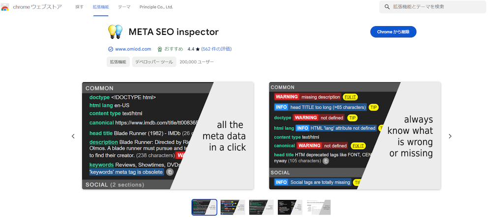 META SEO inspectorはchromeの拡張機能なので、インストールしておくとインターネット回遊中に気になるページを閲覧中にワンクリックでSEOに関する情報をすぐに確認できます。