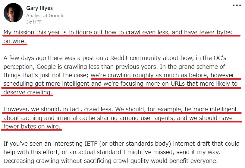 Gary Illyes(ゲイリー・イリース)氏は、2024年のミッションはクロールを少なくし、ネットワーク上の通信量を減らす方法を見つけることだとLinkedInで投稿しました。