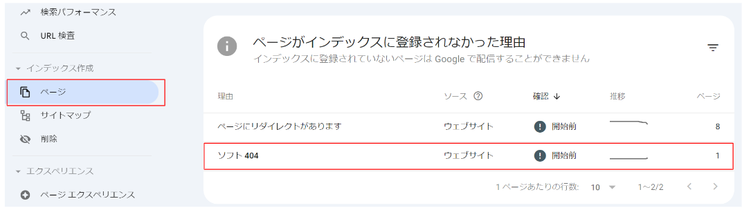 Webサイトでソフト404エラーが発生している場合、左メニューの「インデックス作成」>「ページ」>「ページがインデックスに登録されなかった理由」に表示されます。