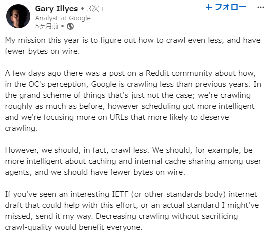 Google社員のGary Illyes(ゲーリーイリース)氏は「今年のミッションはクロールを少なくし、ネットワーク上の通信量を減らす方法を見つけることだ」と言及しました。(情報源:https://www.linkedin.com/feed/update/urn:li:activity:7180832169156562945/