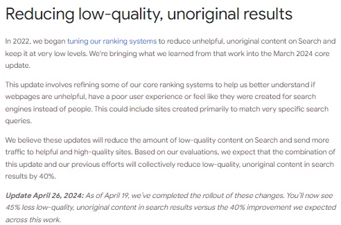 2024年4月26日更新:4月19日をもって、これらの変更の展開が完了しました。この結果、検索結果に表示される低品質で独自性のないコンテンツは、当初予想していた40%の改善を上回り、45%削減されました。