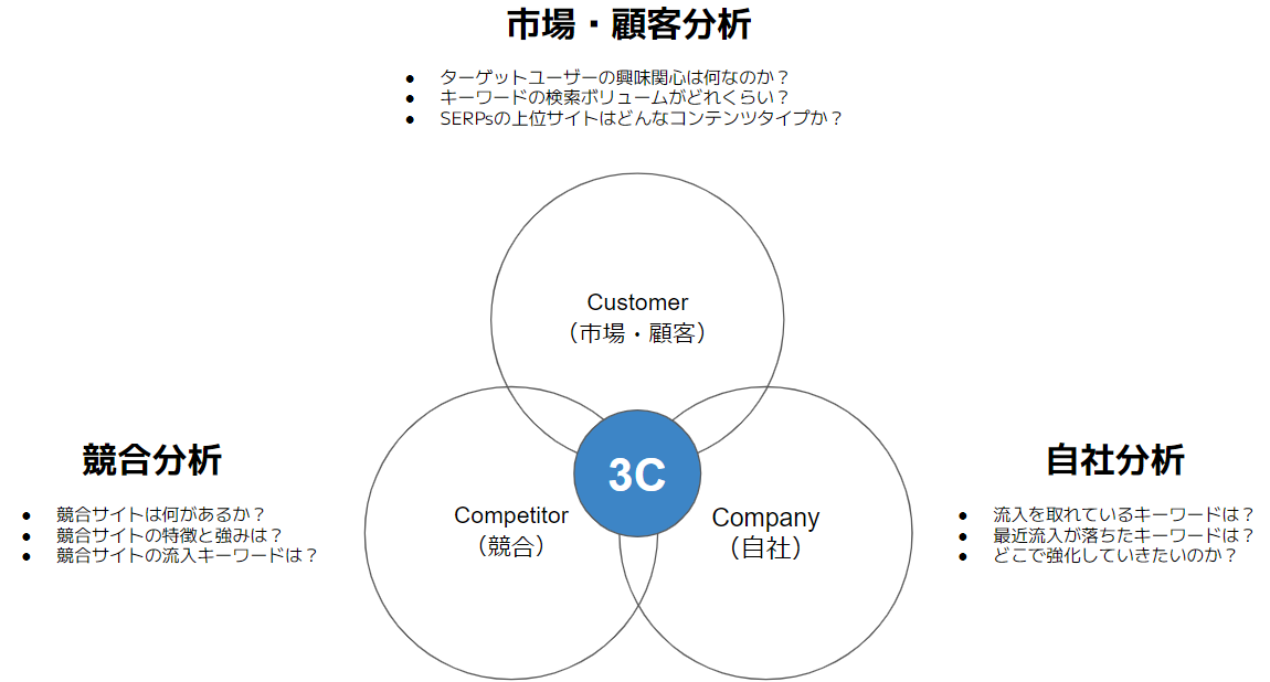 キーワード選定の3つのポイント(1.自社の目的を達成できるか、2.検索需要があるか、3.上位表示できる可能性があるか)を網羅するためのキーワード選定方法として、弊社は3C分析を採用しています。