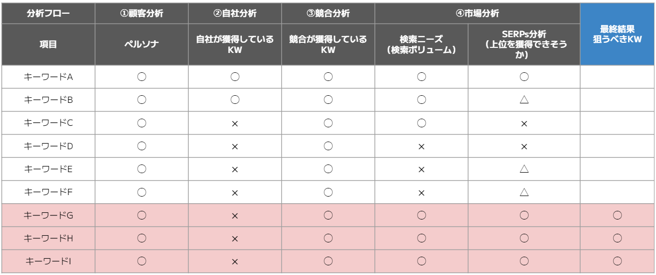 それでは3C分析を用いたKW選定のフローをご説明します。以下は最終的なアウトプットのイメージです。