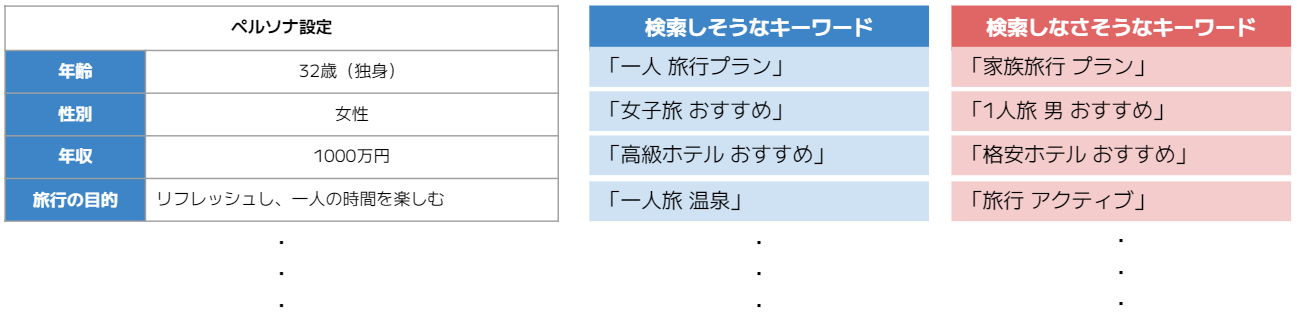 • 旅行の目的はリフレッシュし、一人の時間を楽しむということなので、検索しそうなKWは「一人旅 温泉」、検索しなさそうなKWは「旅行 アクティブ」