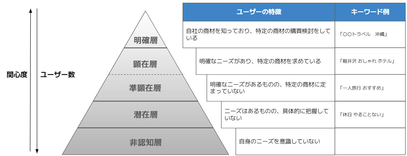 ユーザーを非認知層、潜在層、準顕在層、顕在層、明確層の5段階に分けて、明確層に近ければ近いほど、自社製品に対する関心度が高まりますが、ユーザーの母数も少なくなります。非認知層に近ければ近いほど、自社製品に対する関心度が下がりますが、ユーザーの母数も多くなります。
