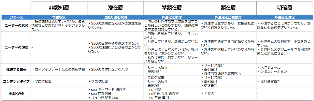 弊社のSEOコンサルティングというサービスのKW選定におけるカスタマージャーニーを、具体例として挙げさせていただきます。