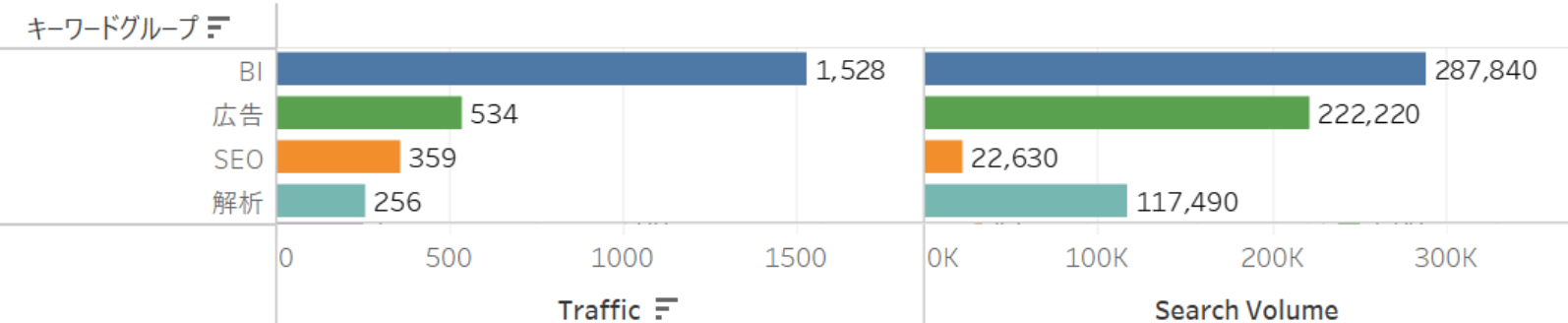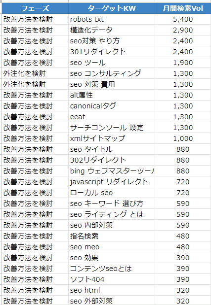 ①検索ボリューム観点で優先度を決める場合は、単純に検索ボリュームが大きい順に並び替えることで、対応優先度が決まります。