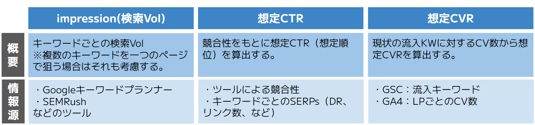 キーワードの対応優先順位は①impression(検索ボリューム)、②想定CTR(クリック率)、③想定CVR(コンバージョン率)の3つの観点があり、セッション数に重きを置くか、CV数に重きを置くか、など目標とする指標によって、優先度を適宜変更します。