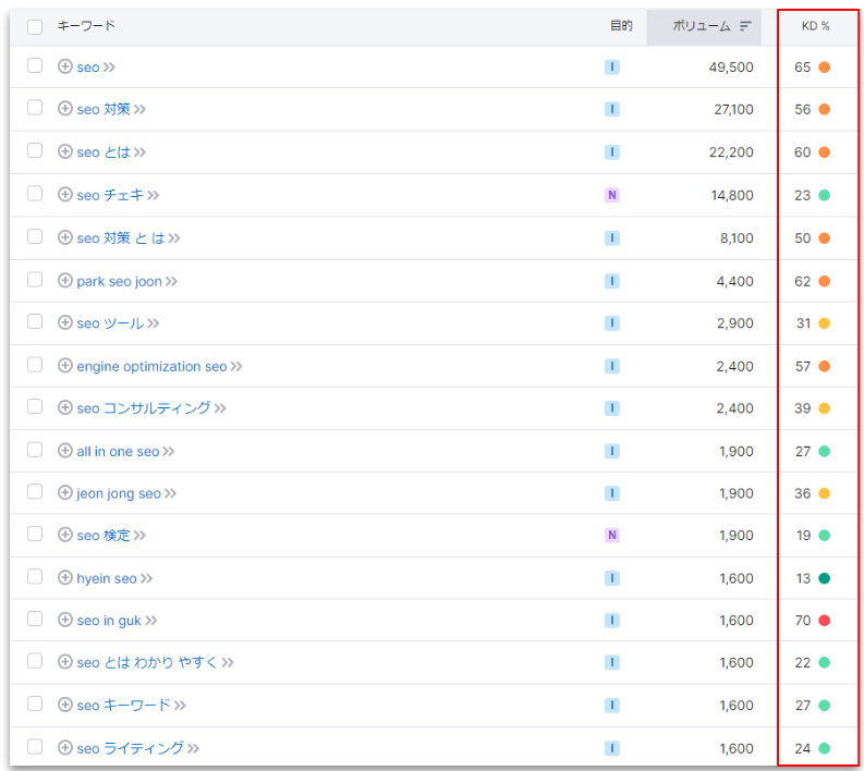 SEO外部ツールには「KD%」というキーワードの難易度指標があり、この外部ツールの指標を参考に、想定CTRを算出しています。