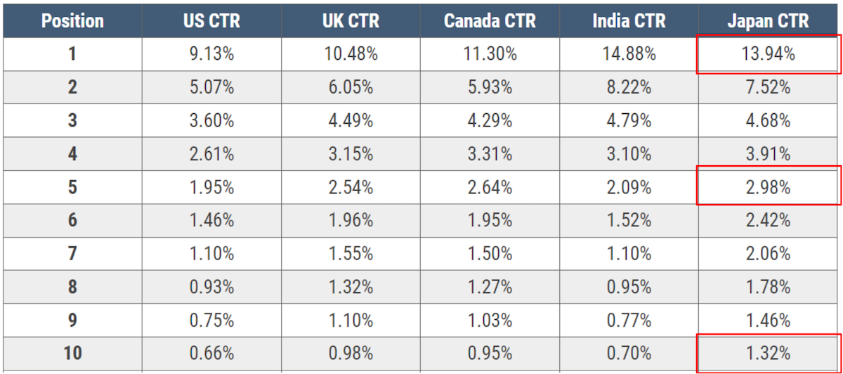 SEOClarityというアメリカのソフトウェア会社調査結果によると、日本において、Google検索のランキング1位のCTRは13.94%、5位は2.98%、10位は1.32%となりますので、こちらの調査結果を参考に、想定CTRを算出できます。