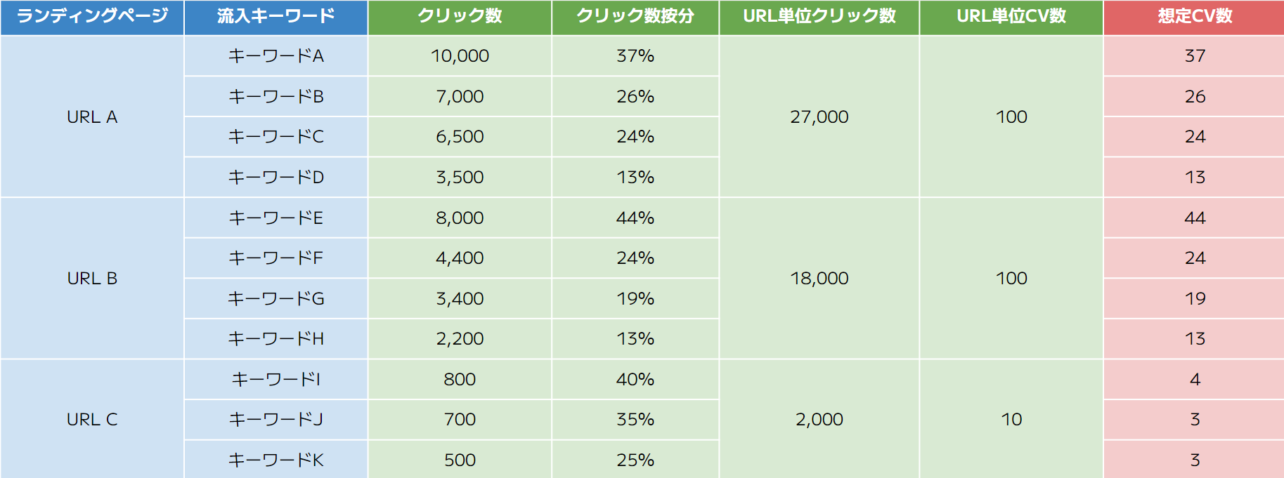 このクリック数按分の数値をCVにも適用すると、各キーワードごとの想定CV数も算出できます。例えば「キーワードA」のURL単位CV数は100なので、按分の37%を適用すると、想定CV数が37になります(100 × 37% = 37)。