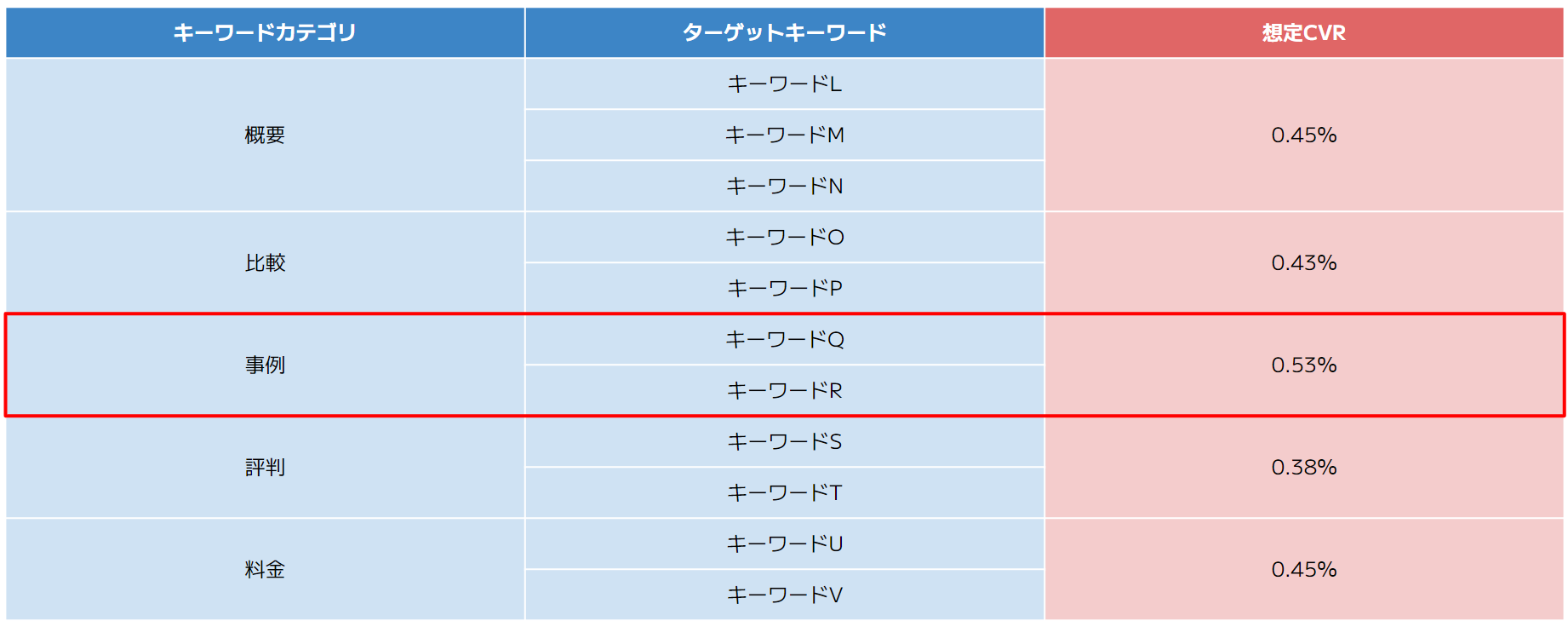 「事例」に属するキーワードGとJの想定CVRが0.53%という結果が出ます。