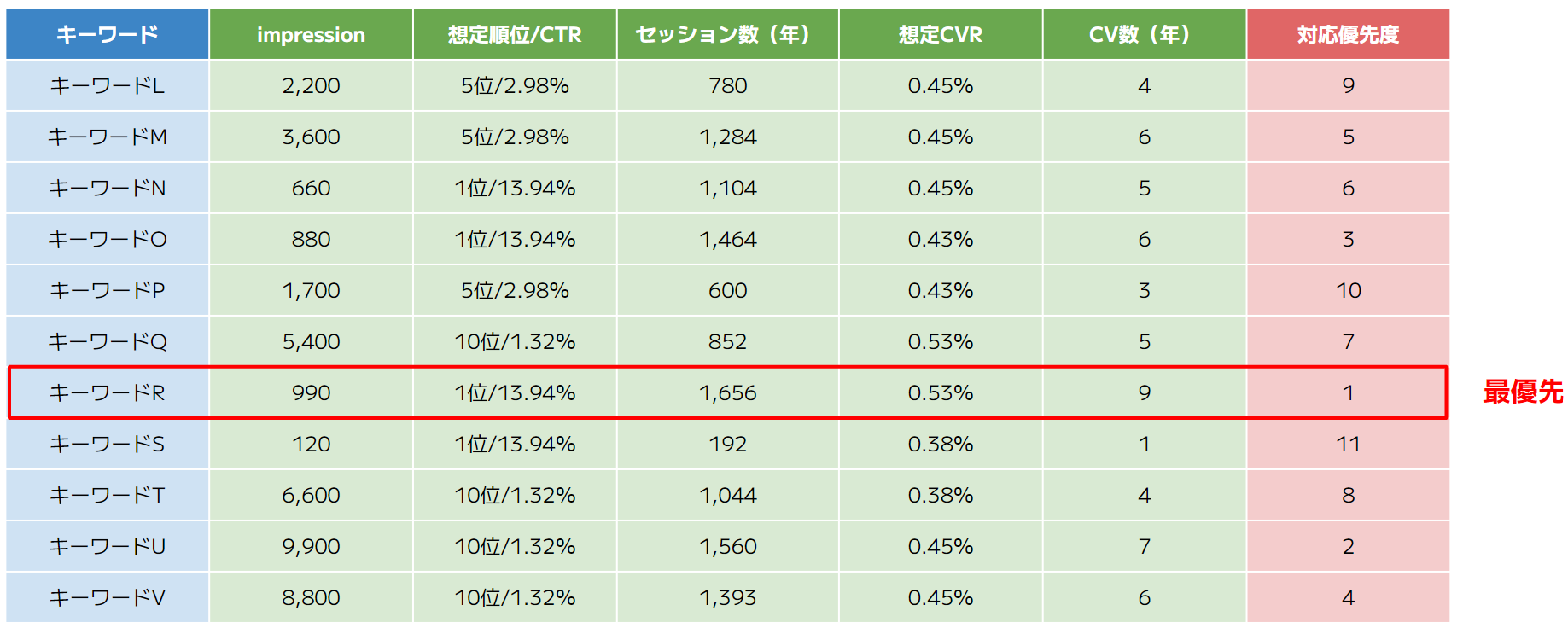 コンバージョン率に重きを置いた場合、想定CVRが一番高いキーワードRが優先度最上位のキーワードとなります。