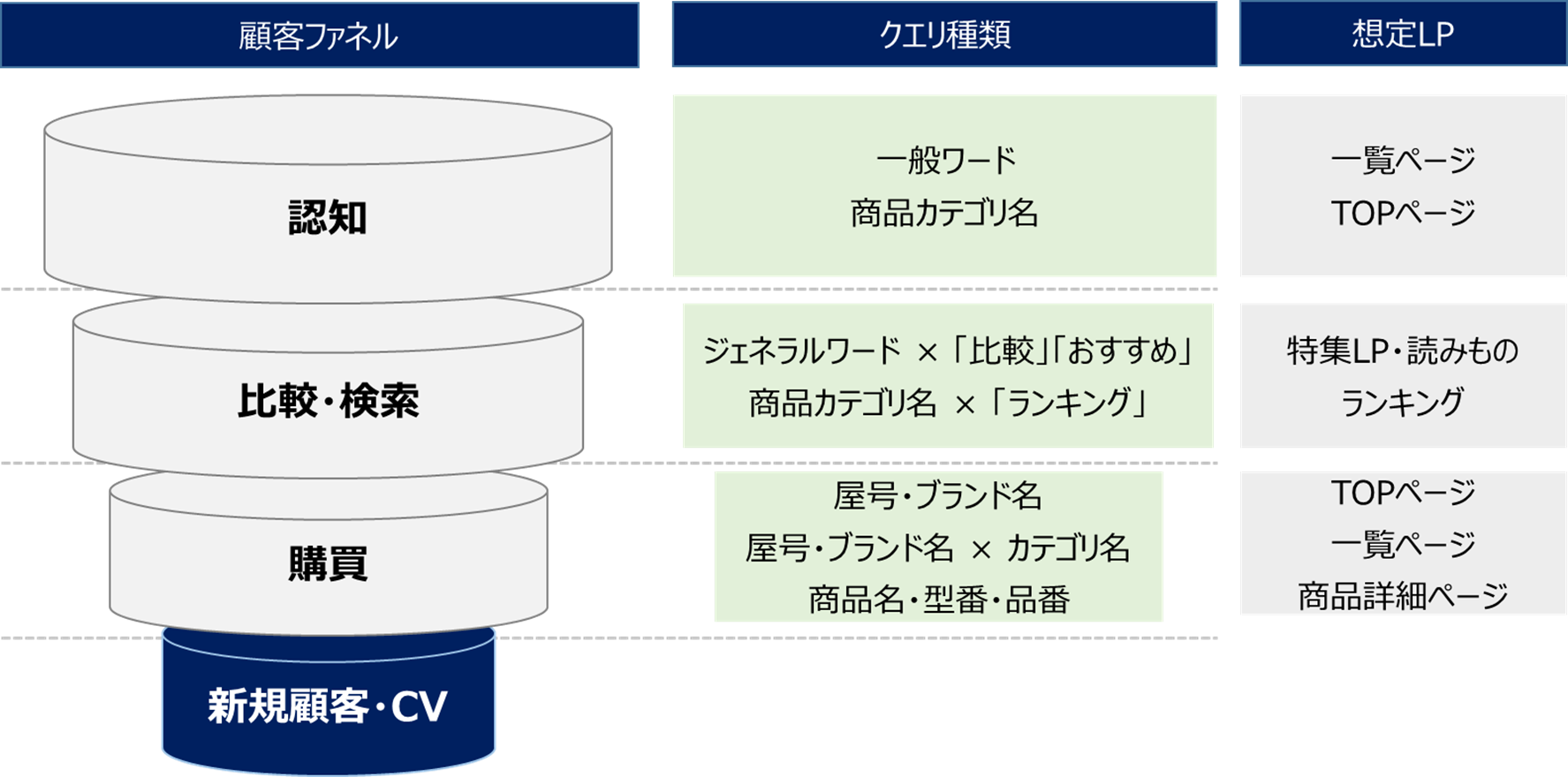 図:ECサイトにおけるマーケティングファネルとキーワード設計の例