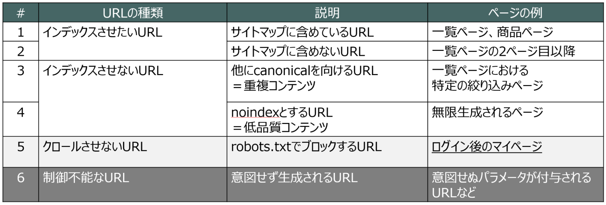 ウェブサイトにおけるURLは、下図の6種類に大きく分類されます。それぞれの分類ごとに、URLを適切に管理していくことが重要となります。