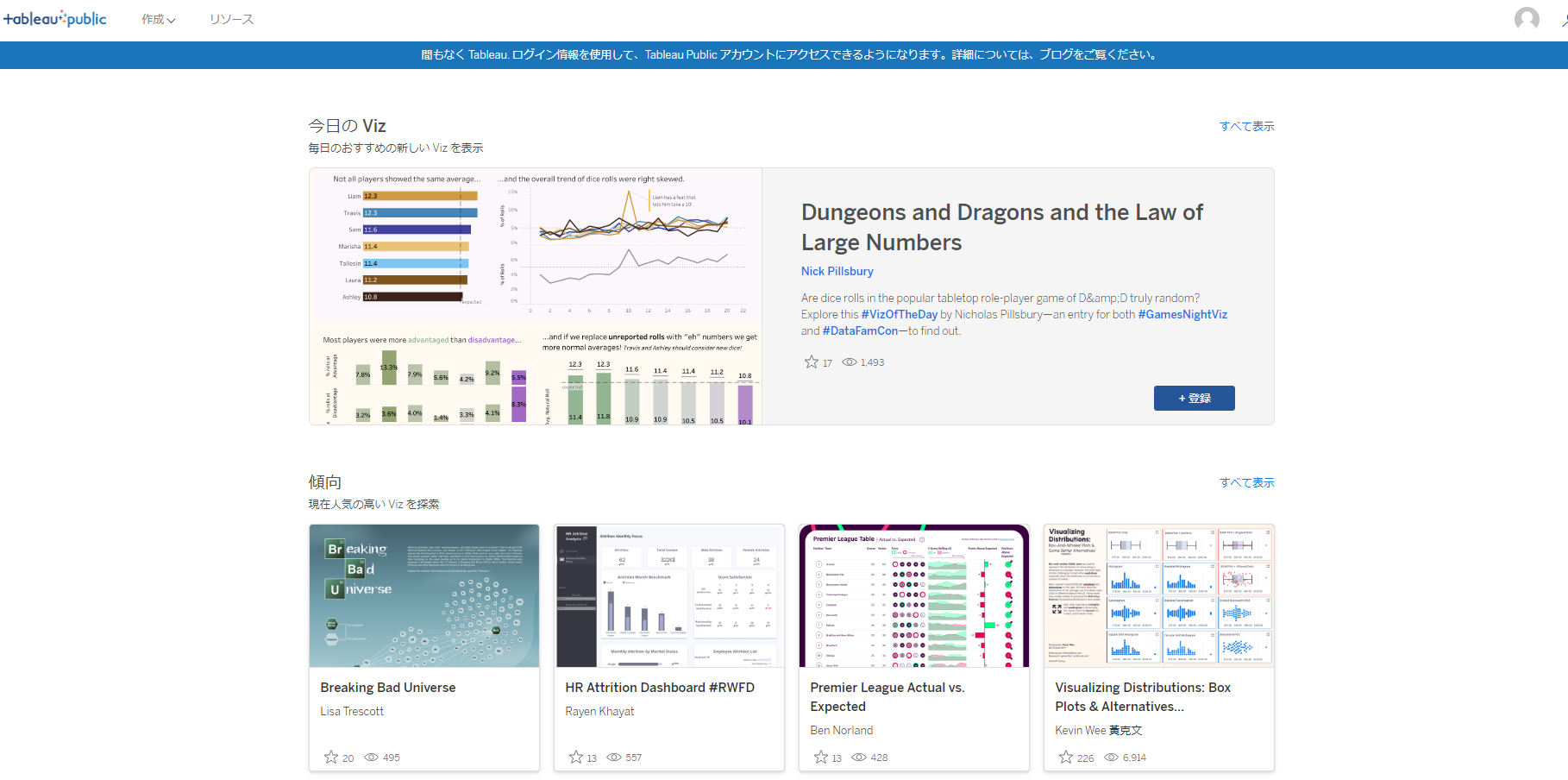 世界中のユーザが公開したダッシュボードを学べるサービスがあります。こうした共有サービスは、ユーザ同士の学びあいは勿論、勉強したことを世界に公開するのに最適な手段の1つとなります。