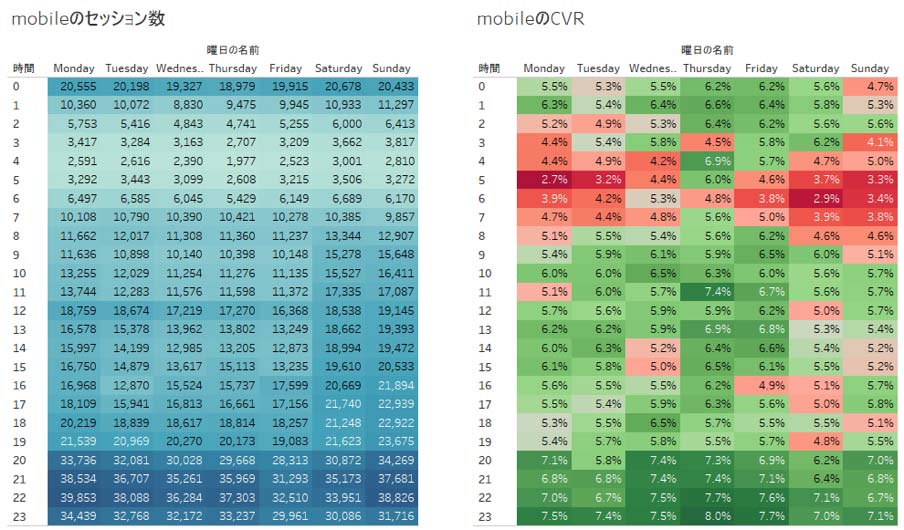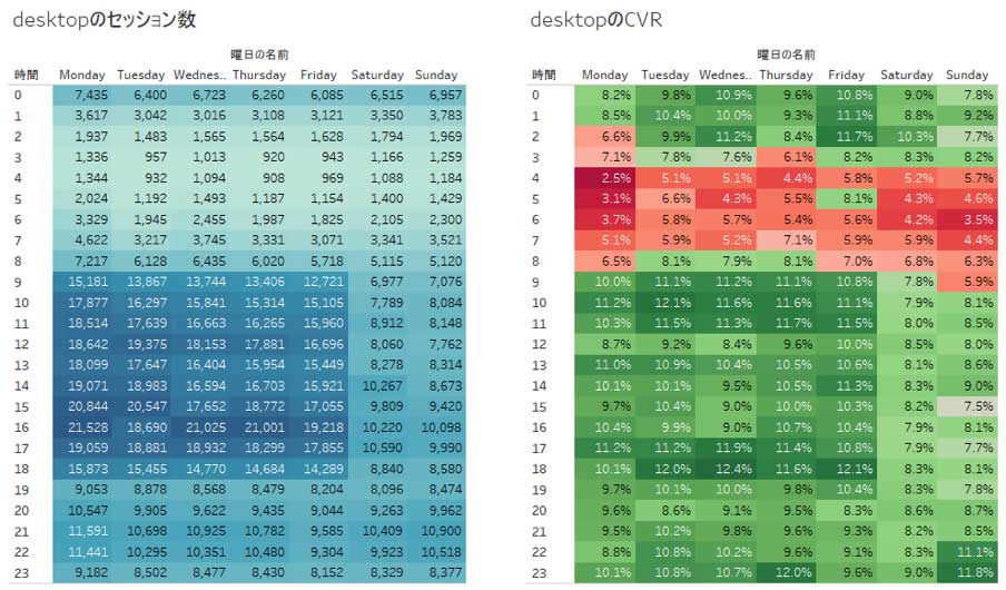 desktopとmobileでサイト利用タイミングの傾向が異なっています。desktopは平日の昼間、mobileは夜の時間帯にサイト利用が活発で、コンバージョン率も高い傾向がありそうです。
