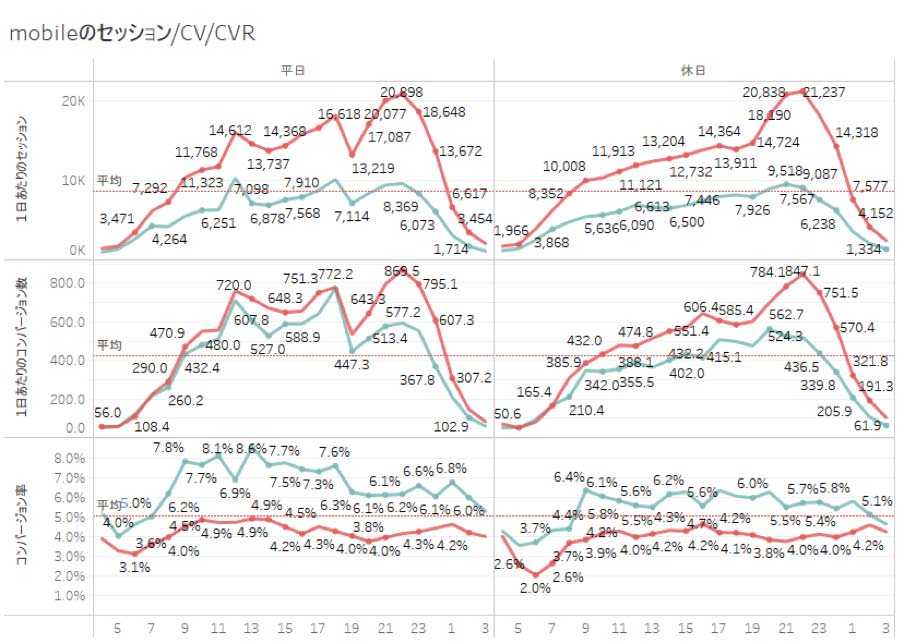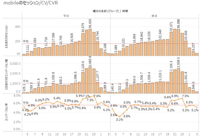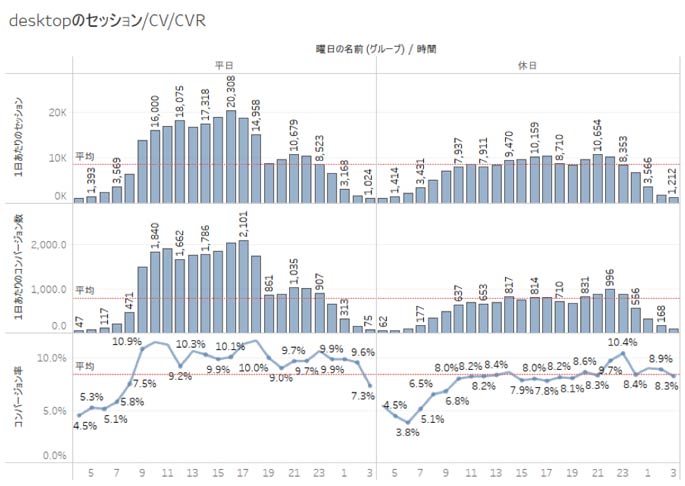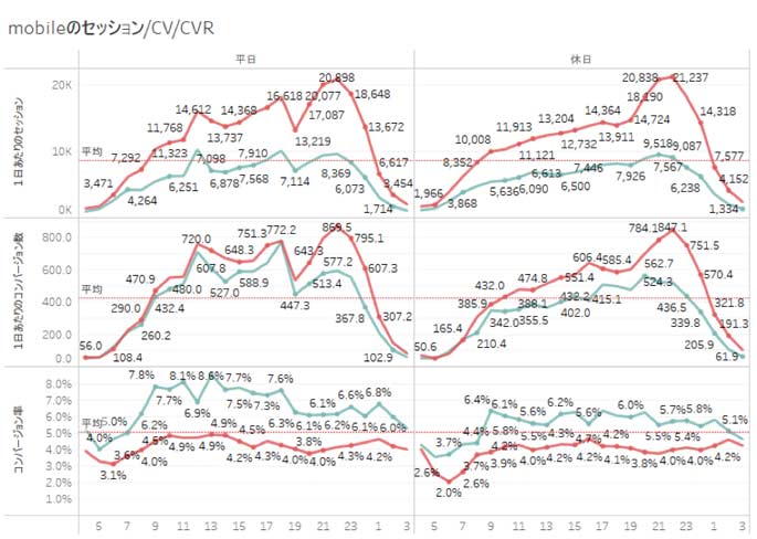 desktopは平日9~18時のオフィスアワーに、mobileは平日、休日問わず、夜20~23時に流入が多く、コンバージョン率が高い傾向があります。