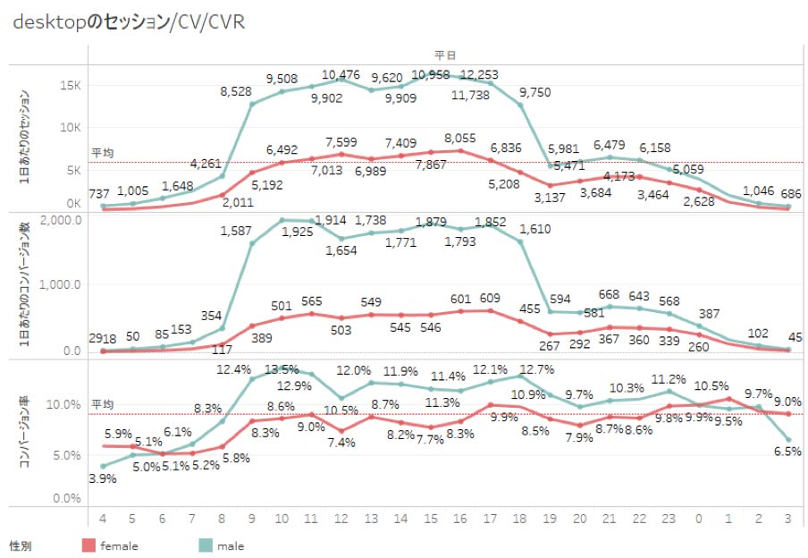 一方で、プライベートの利用が主に想定されるmobileは女性の利用が多いですが、コンバージョン率は全体的に男性のほうが高い傾向が見られます。