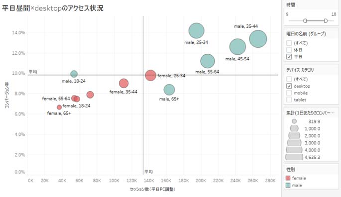 平日オフィスアワーのdesktopのアクセスについて、性別×年齢別にセッション数とコンバージョン率で散布図にしました。