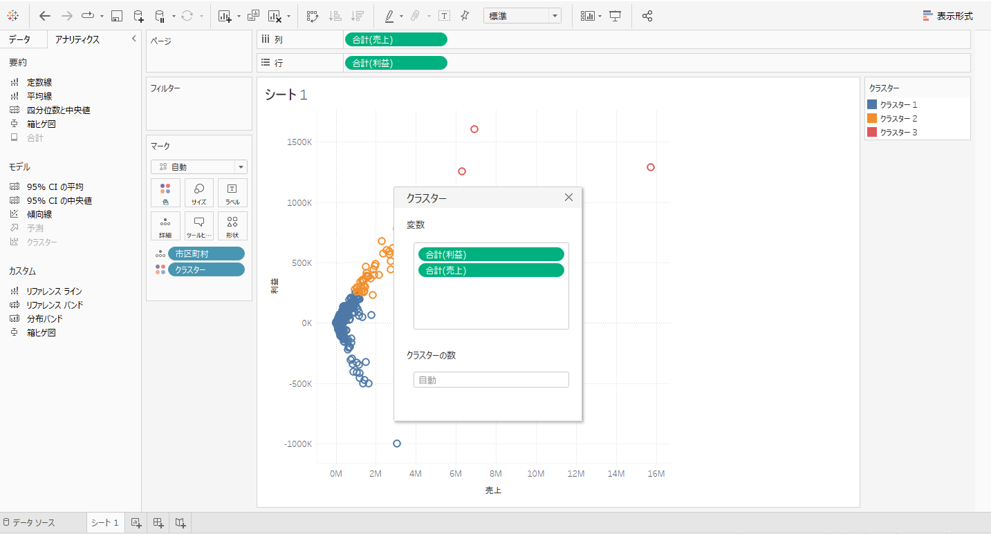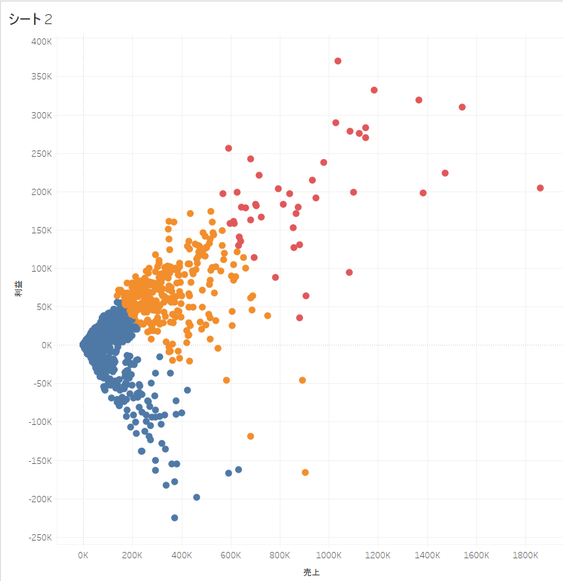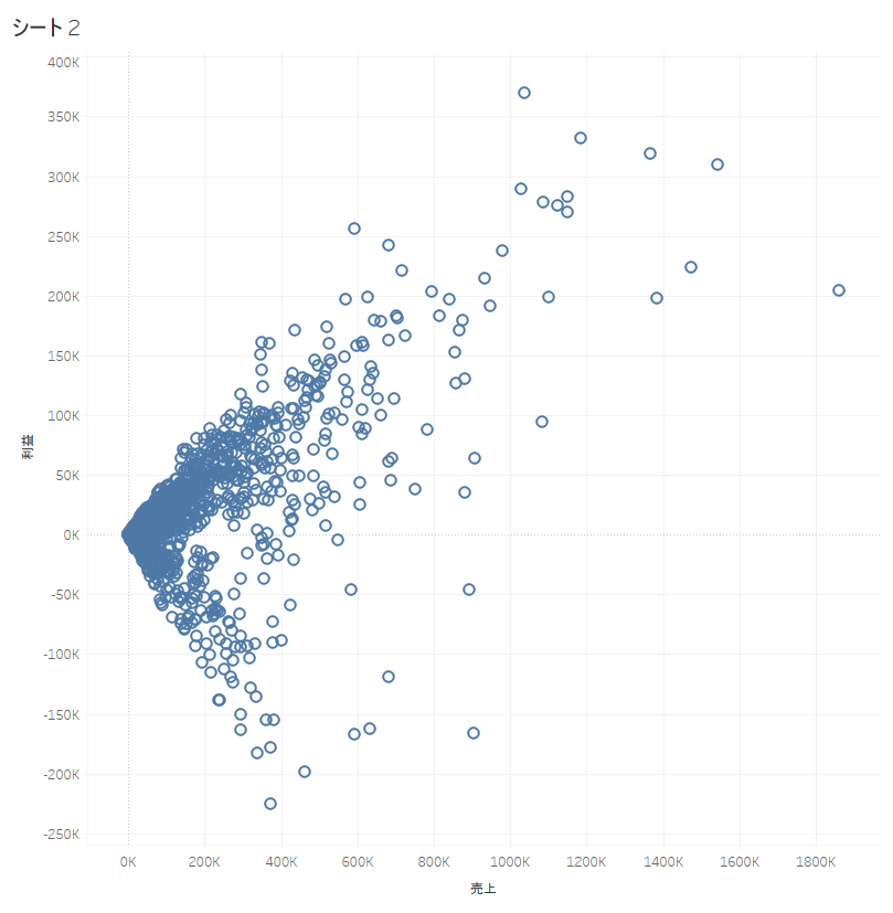 散布図は二次元なので、上記の変数から選んだ[売上][利益]を表示させることにしました。※結果が意味のないものであれば表示する変数を色々組み合わせて試します。