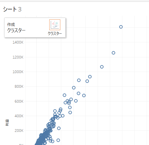 手順② 画面左側のサイドバーのアナリティクスペインから「クラスター」をクリックしたまま、シートにドラッグすると、クラスタの表示がされるのでそこにドロップ。