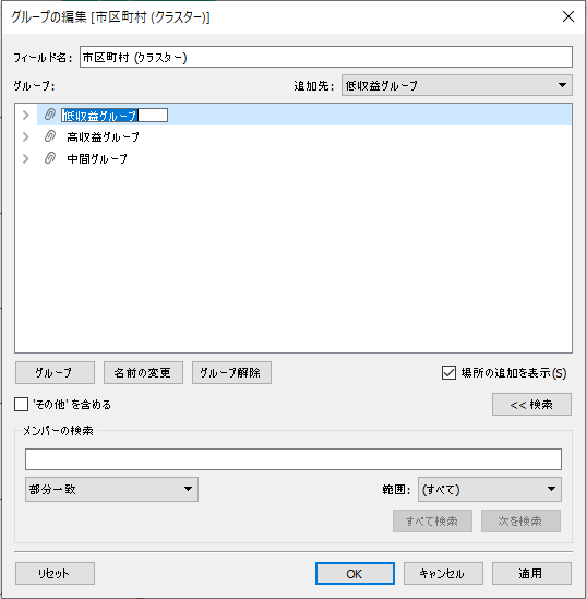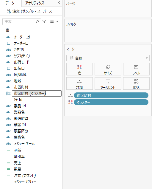 クラスターの名称が決まったところで、Tableauで名前を早速変更しましょう。そのためにはクラスターをクラスタグループ型の項目に変更します。