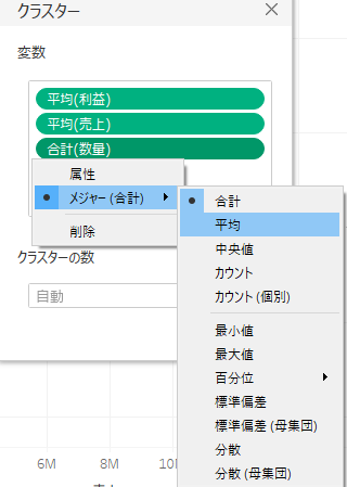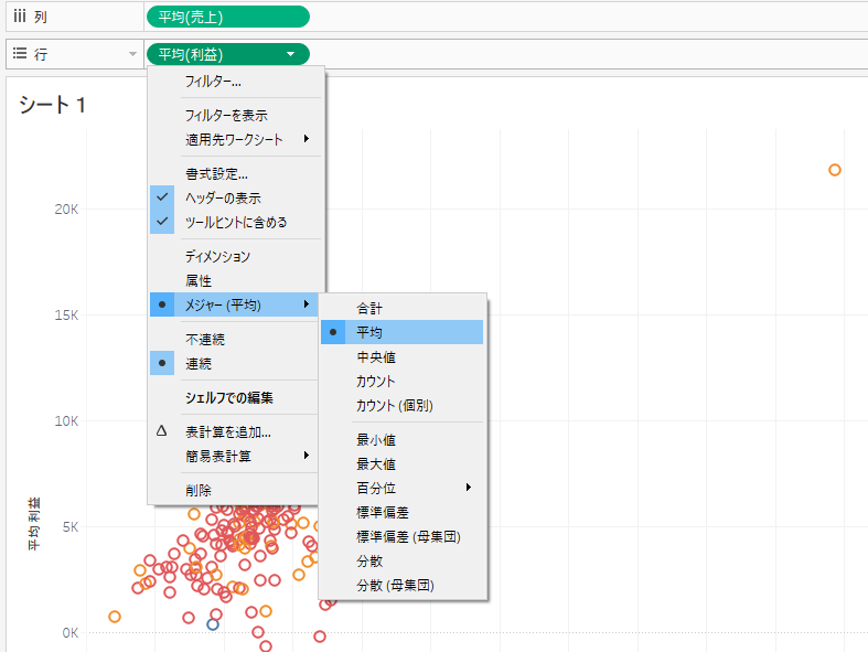 クラスタリングで用いた変数は「売上・利益の平均値」ですので、散布図の軸も同様の値に変更しましょう。列と行の売上と利益のピルの▼から平均値に変更してください。