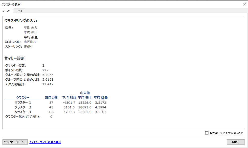「クラスターの説明」には気になる情報がたくさんあるかと思いますが、これらはクラスターの散らばり具合やクラスタ間の距離、統計的なモデル評価指数を表示しており、高度な分析をするためのものです。詳しくは公式のページ「データ内のクラスターを見つける – Tableau」をご覧ください。