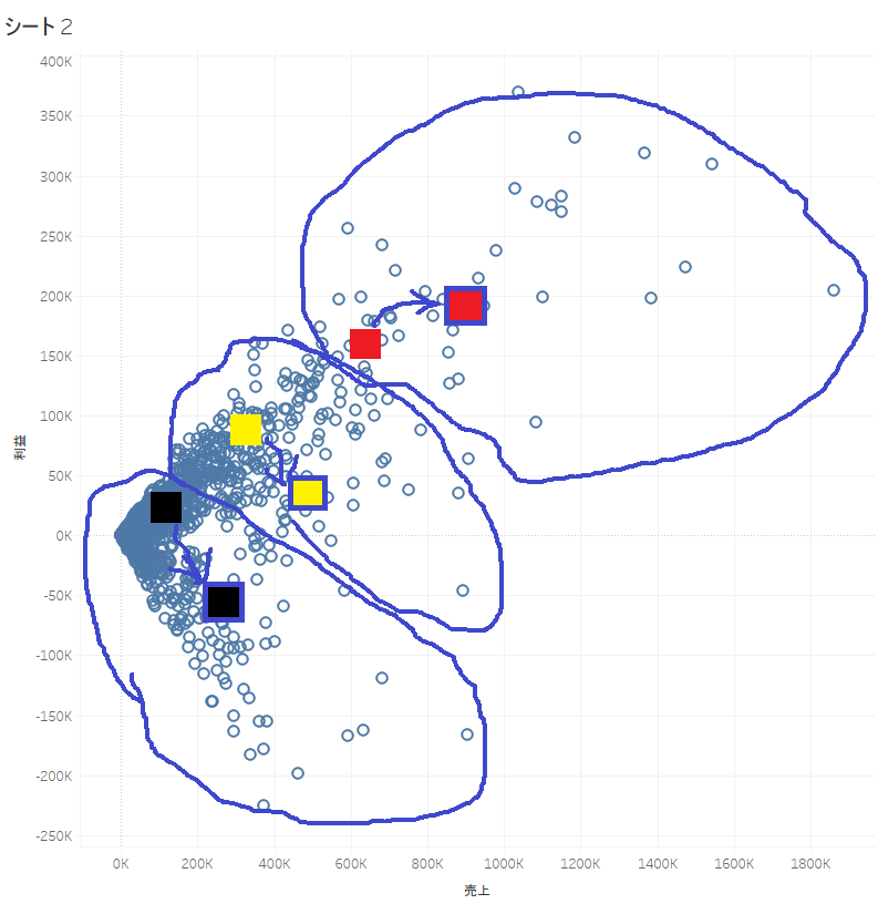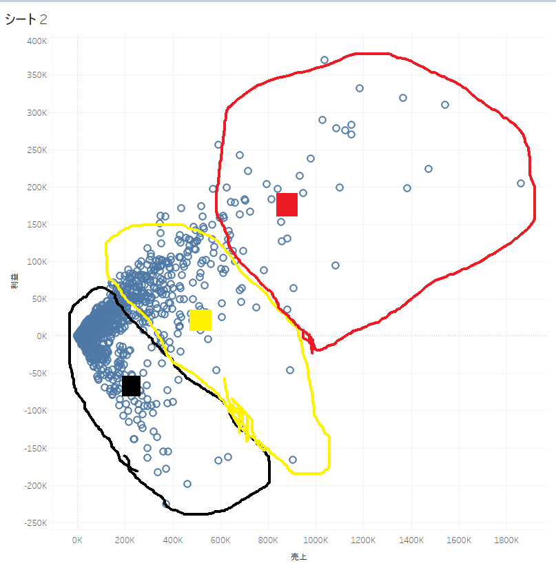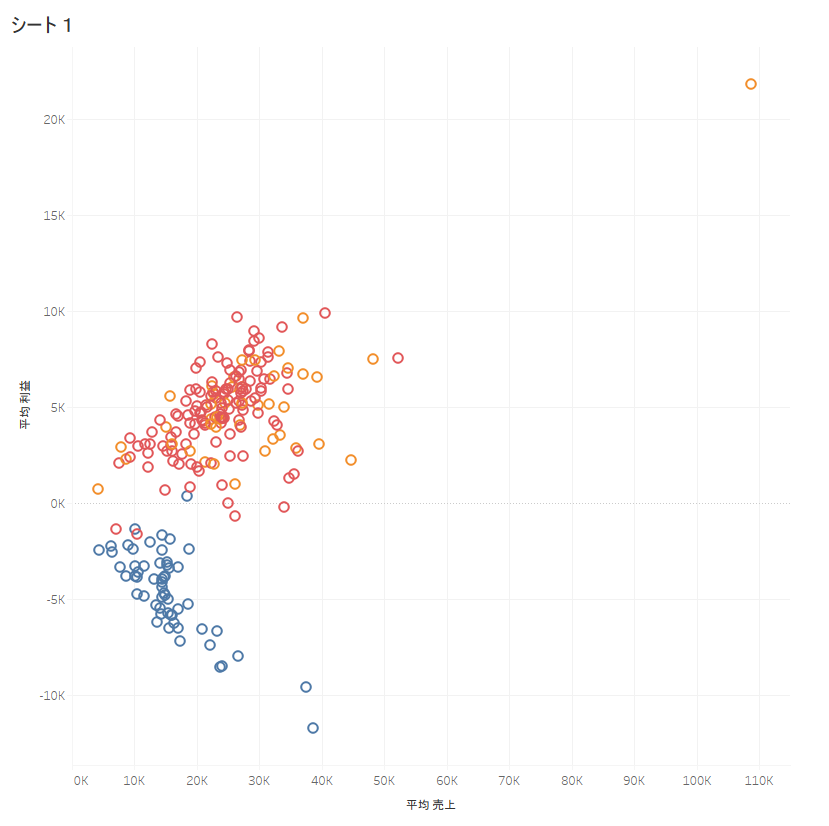 散布図の行列(売上と利益)の集計方法を合計から平均に変換して、クラスタリングの結果を観察してみましょう。