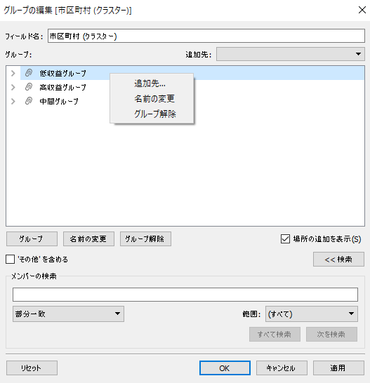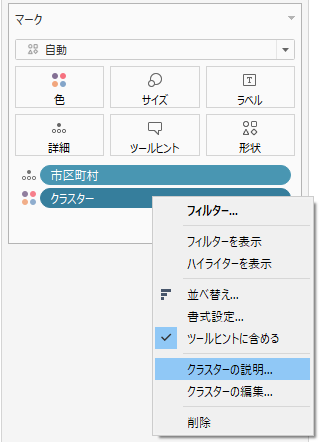 マークカードに追加された「クラスター」を右クリックし、「クラスターの説明」を選択すると、クラスタリングの詳細が表示されます。