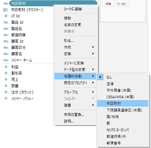 ① 市区町村の項目のデータ型を文字型から「地理的値」型に変更