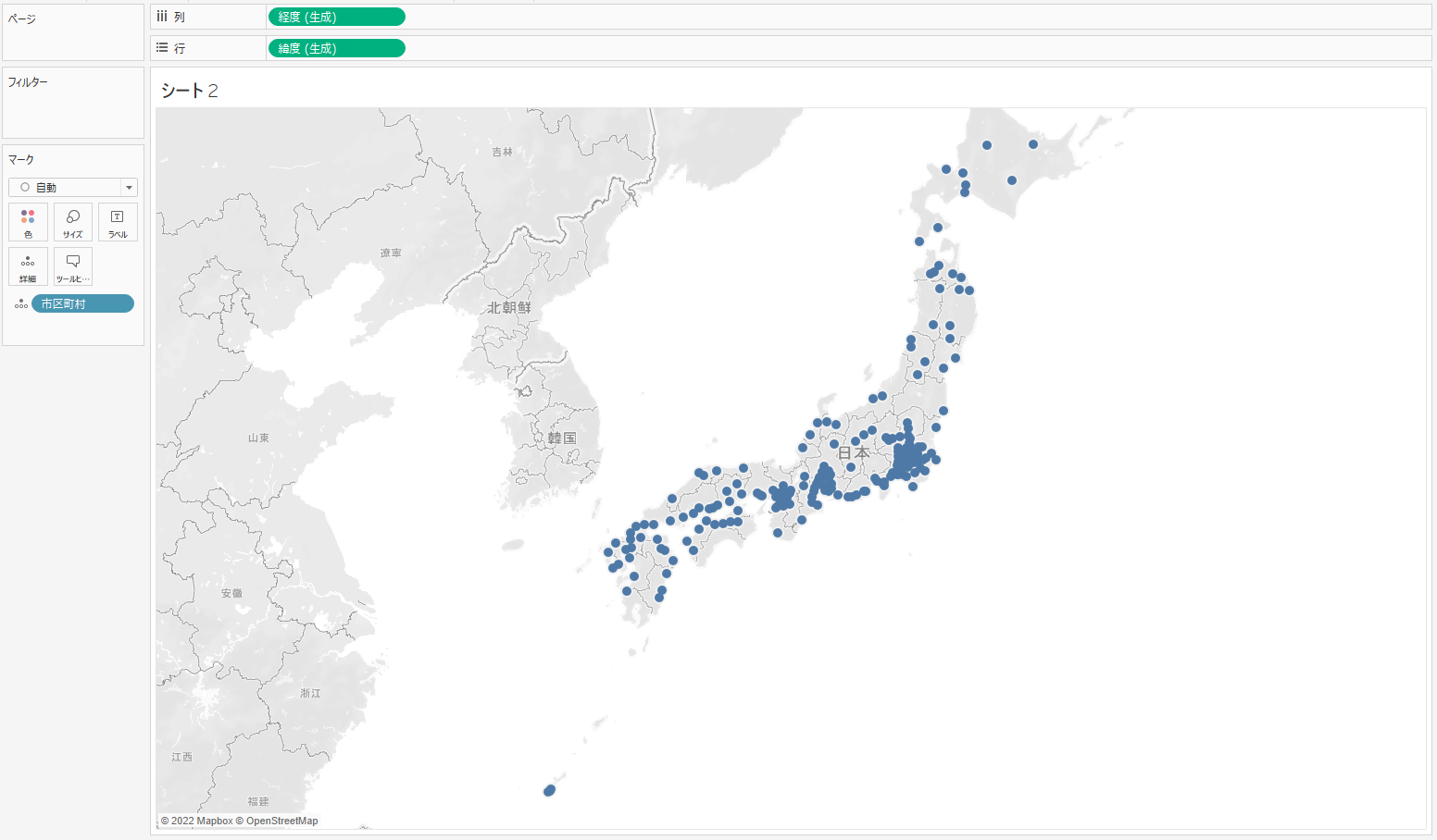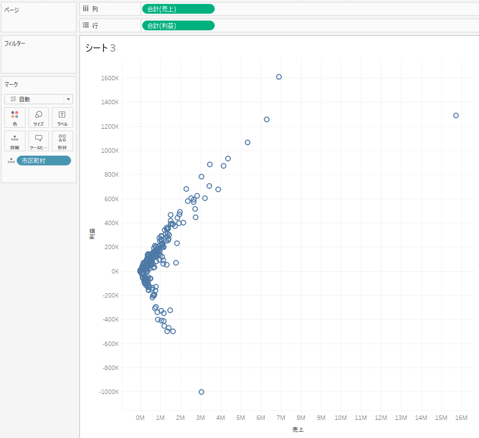 手順① 行に「利益」、列に「売上」、詳細に「市町村」を持つグラフを作成します。