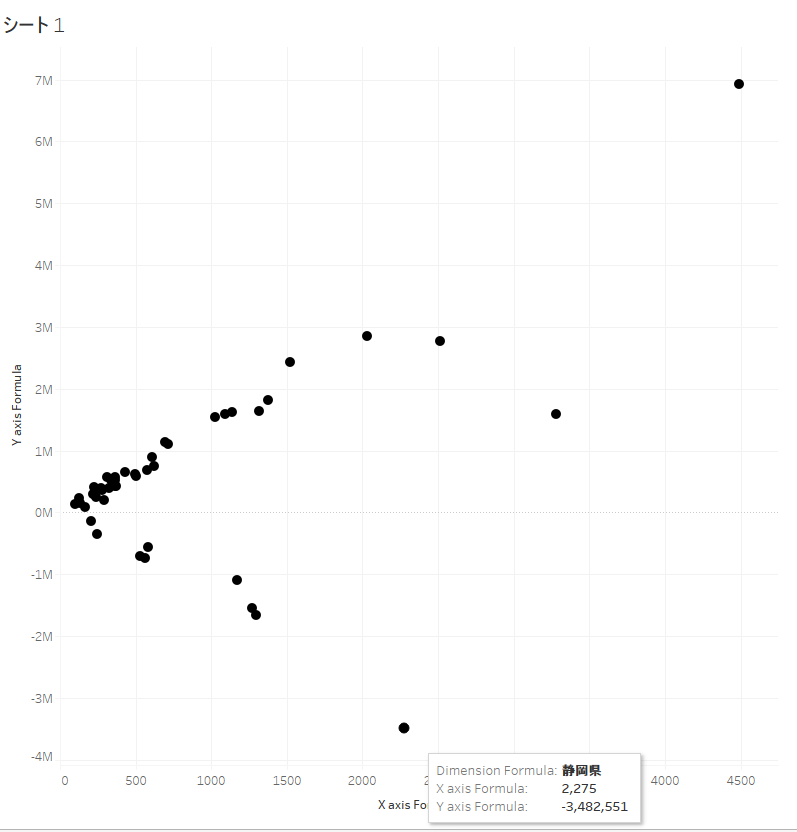 要するに、散布図は二つの値に相関関係があるかどうかを確認するのに使われるグラフです。メジャーなグラフの一つであるので、もちろんTableauの標準機能で実装することが可能です。