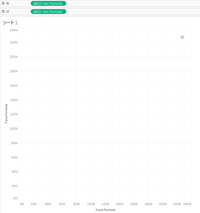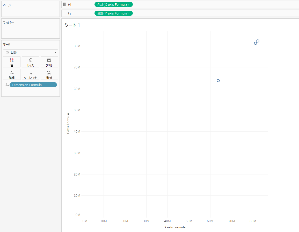 今は各メジャーの合計値をプロットした一点だけになっています。マークカードの「詳細」にディメンションを加えて散布図の表示にしましょう。