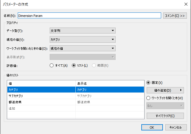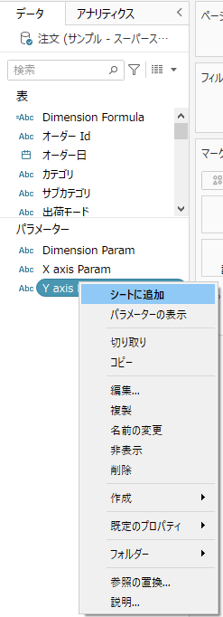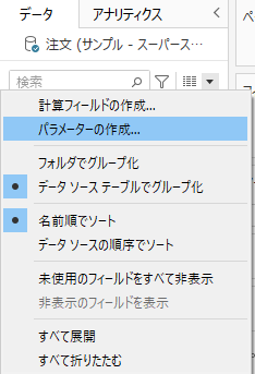 データペインから「パラメータの作成」をクリック。以下の設定でパラメータを作成してください。