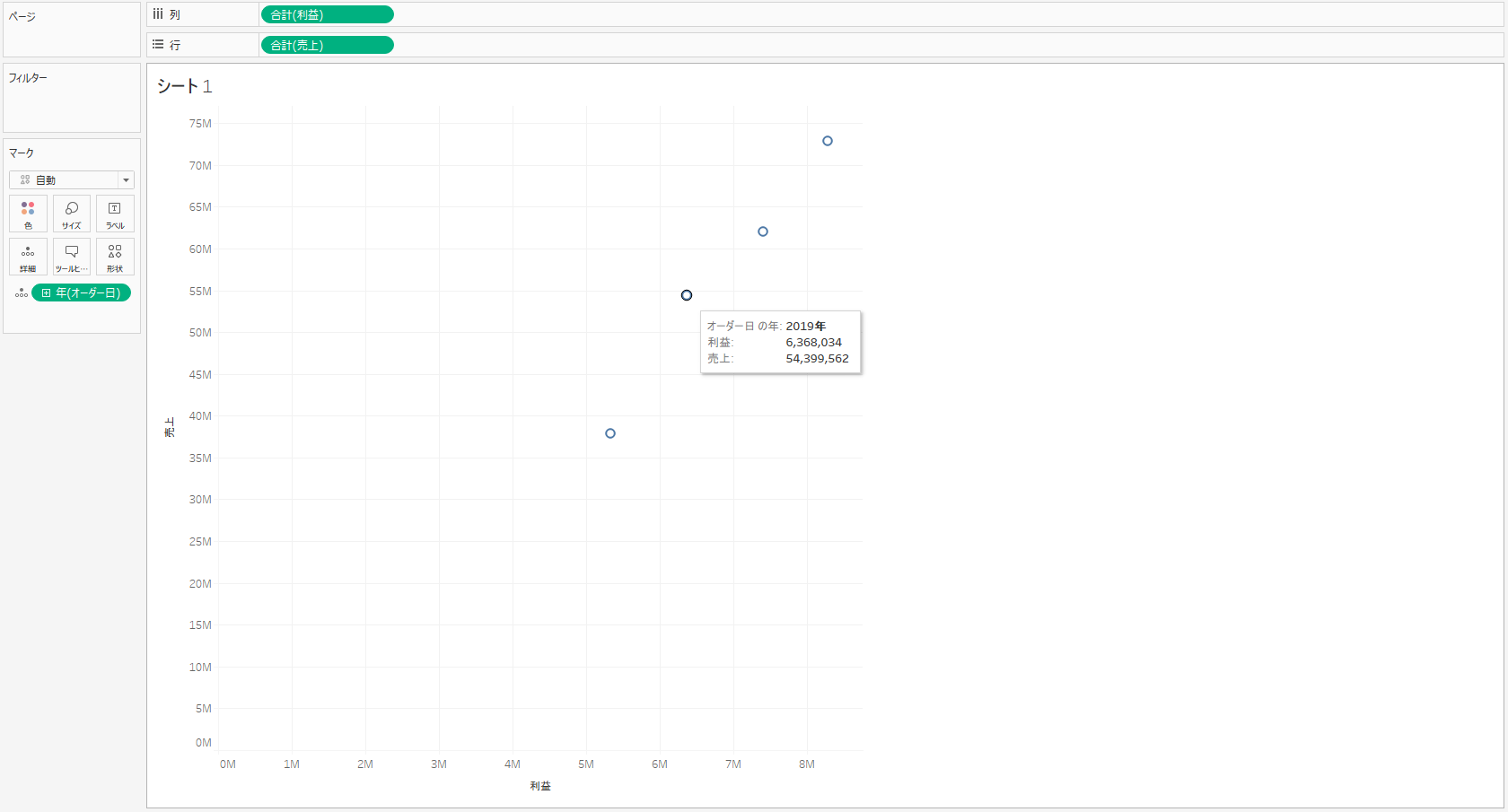 手順3. シートに移動し、行シェルフに「売上」を、列シェルフに「利益」を配置