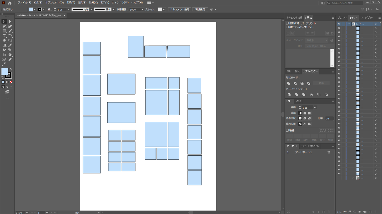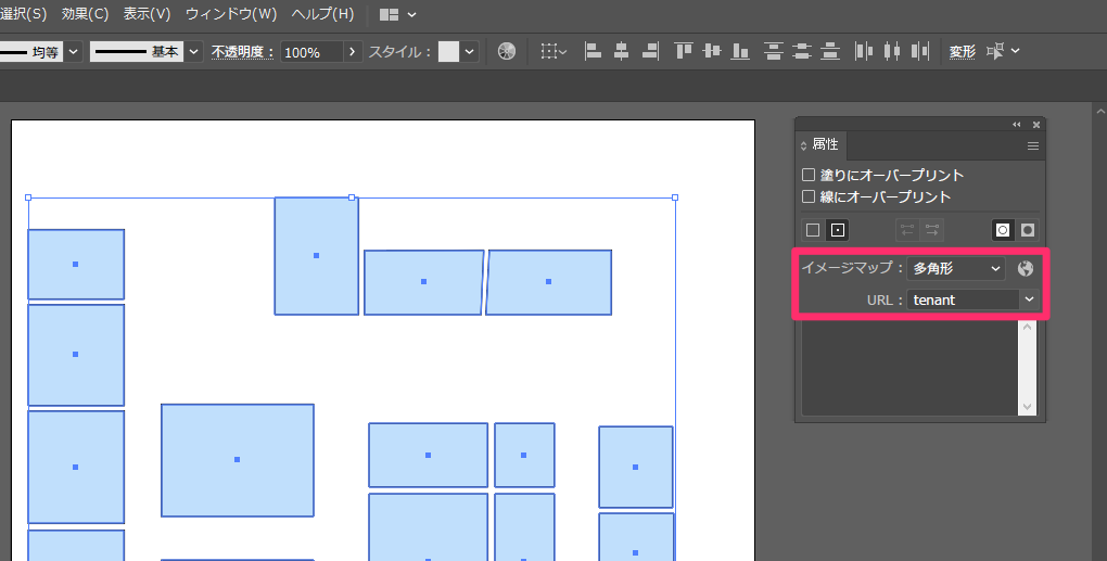 簡単に言えば「Adobe Illustratorでファイルが開けて、テナントをクリックしたら線で囲われた図形になっている」という状態です。