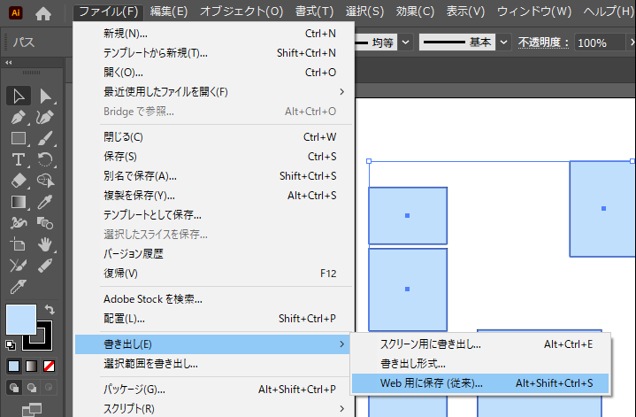 5. 「書き出し」→「Web用に保存(従来)」の順にクリック