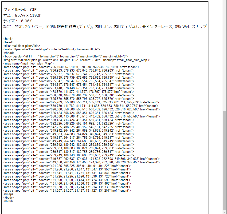 <area shape=”poly”~>の行をテキストエディタなどにコピー&ペーストして保存すると「座標元データ」の出来上がりです。
