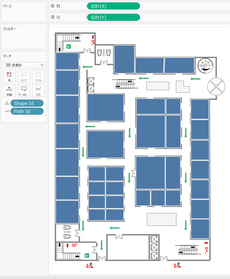 これをTableau Desktopでデータソースとして読み込み、背景イメージ上にレイアウトするとカスタムポリゴンマップになります。