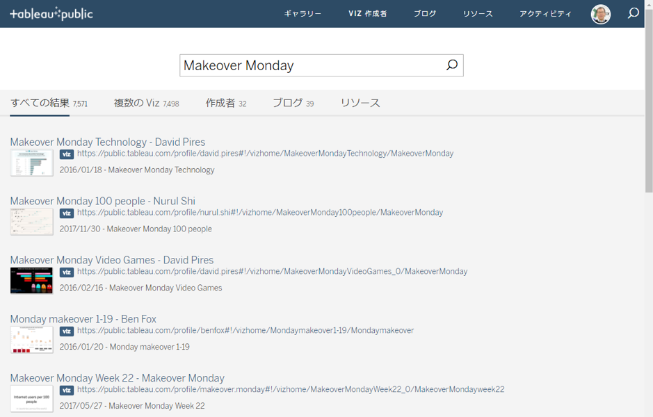 - 以下が、Tableau Publicで「Makeover Monday」を検索した結果ですが、たくさんのVizがパブリッシュされているようです。世界的な活動だといえます。