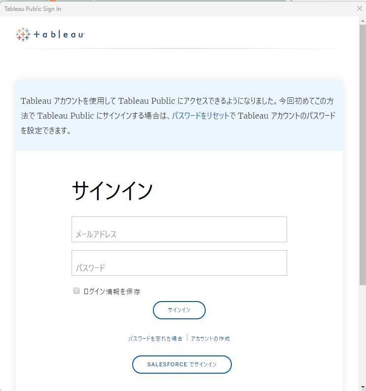 - すると、以下のTableau Publicへのログインを求めるダイアログが現れますので、アカウント作成時に登録したIDとPasswordを入力してください。