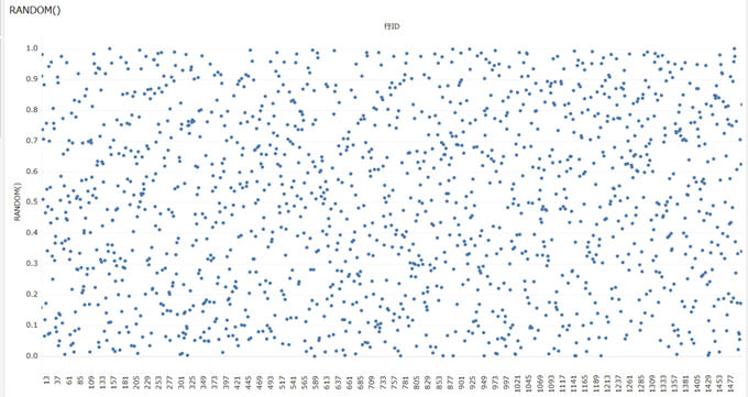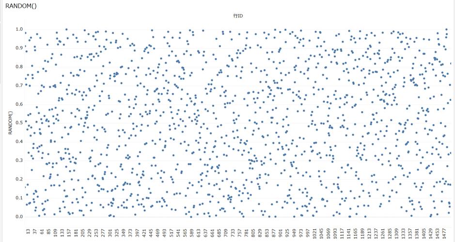 以下が、行ID(1から1500)に対して、RANDOM()を「 円」で表現したものです。きれいに乱数が出ているように見えます。