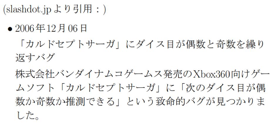 では、サイコロやルーレットのような(それでも重心の偏り等で本当に「でたらめ」かどうかは議論があると思いますが)「物理乱数発生器」を使えばよいのか。と考えるのですが、その場合「再現不能性」という問題があります。