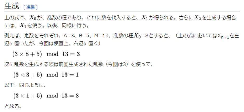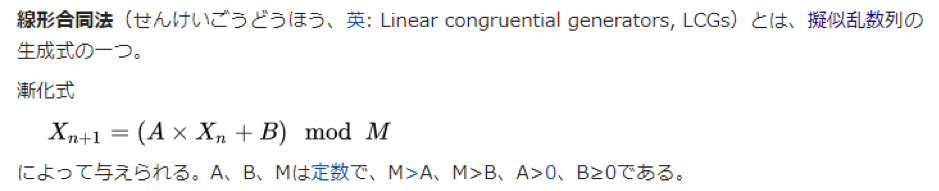 modとは、割った「余り」を求めるので、ものすごく乱暴にいうと、0より大きいある定数(A x Xn+B)をAよりも大きい定数Mで割った余りを使います。さらに、最初の計算で取り出した余りを次のXnとして使います。