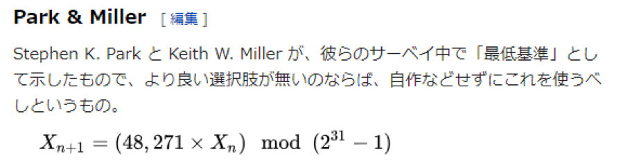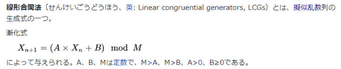 そこで登場するのが、「かなりでたらめ」であり、かつ「再現性がある」性質を持つ、「擬似乱数」です。以下が擬似乱数についてのWikipediaからの引用です。