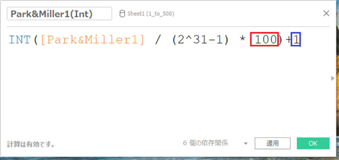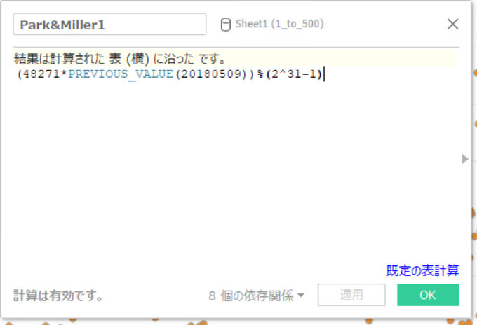 Tableauの計算フィールへの実装は、ページの下部に記述があった、Park & Millerの方法でやってみます。