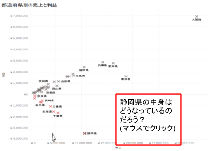 散布図のデータを細かく見るためのドリルダウンを実装します。具体的には、散布図上の都道府県名をクリックすると、その内訳である市区町村のデータを表示させます。