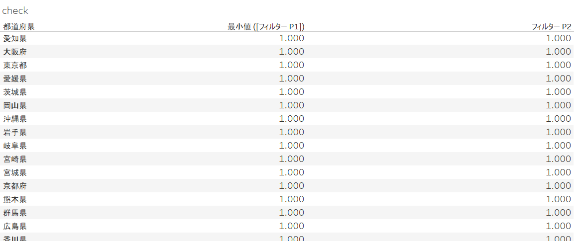 「フィルターP1」では「選択された都道府県 = 2」と「選択されていない都道府県 = 1」が存在することになります。この時「フィルターP2」では「フィルターP1」の最大値を返すため全ての値が「2」がとなります。